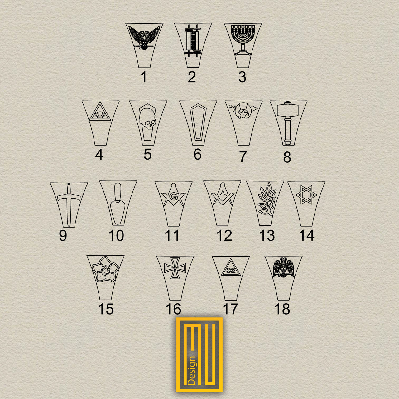 - 14k rose gold square and compasses with a skull symbol will be proportionally placed on the Masonic tile base.