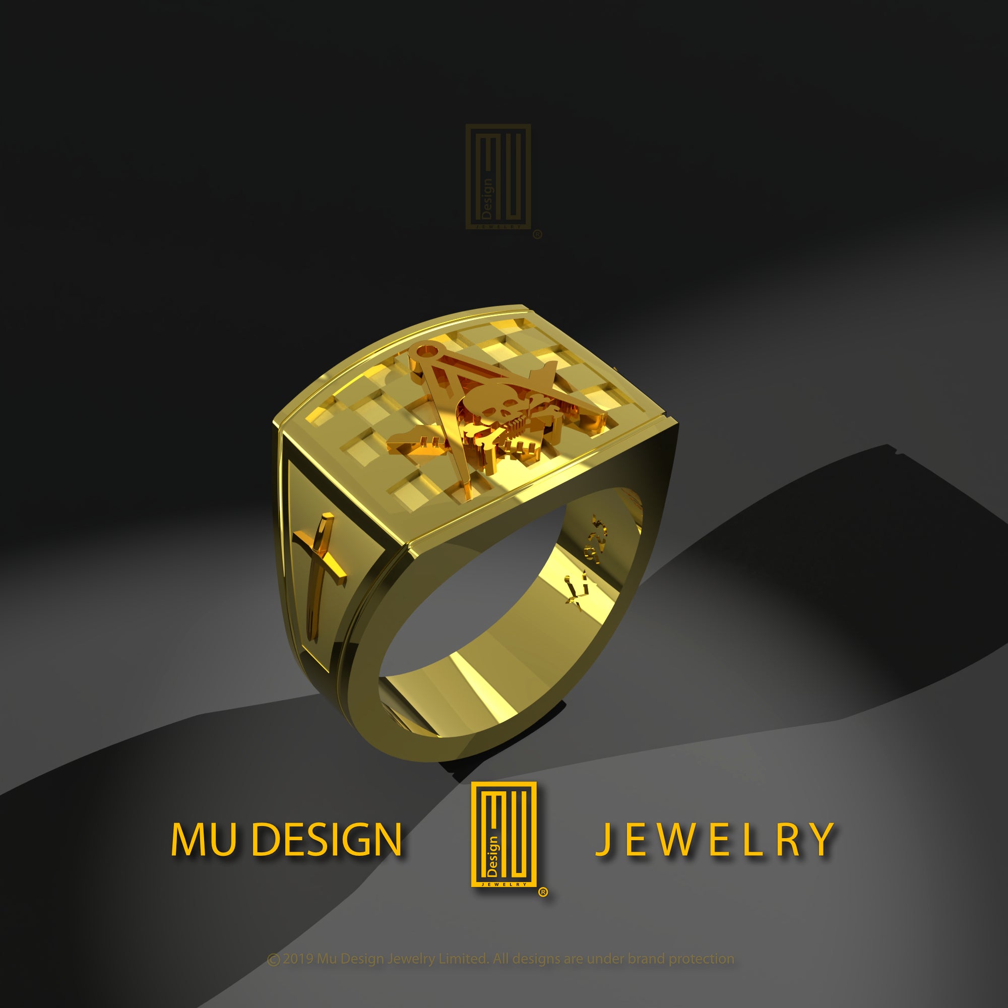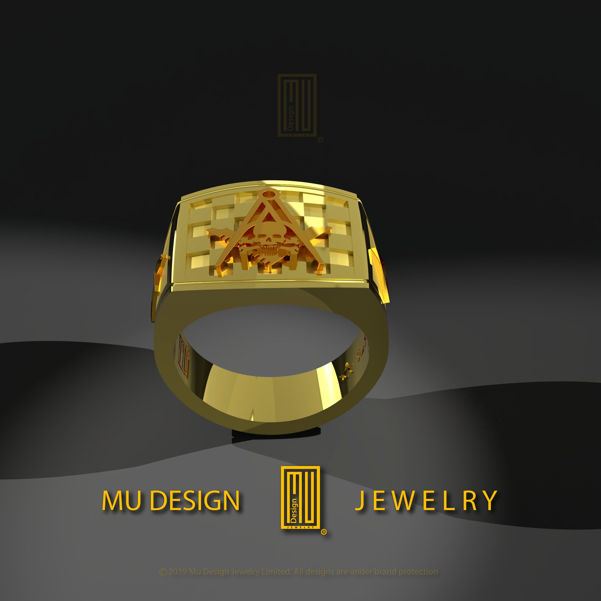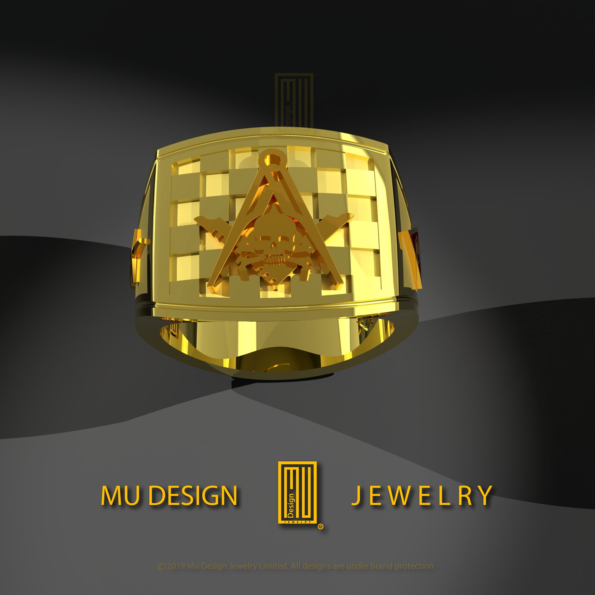 - The main body of the ring will be 14k yellow gold with a Masonic tile pattern on the top.