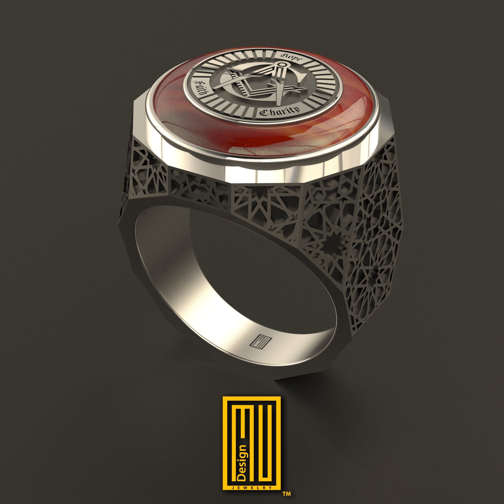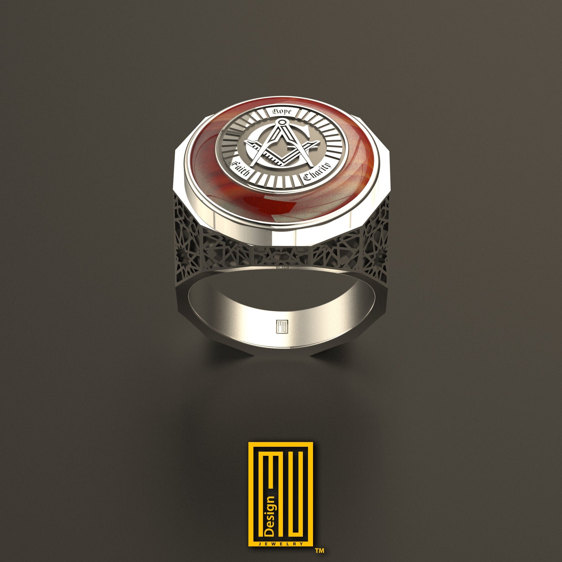 - Special cut Carnelian or Black Onyx gemstone and Sterling silver Square and Compasses symbol