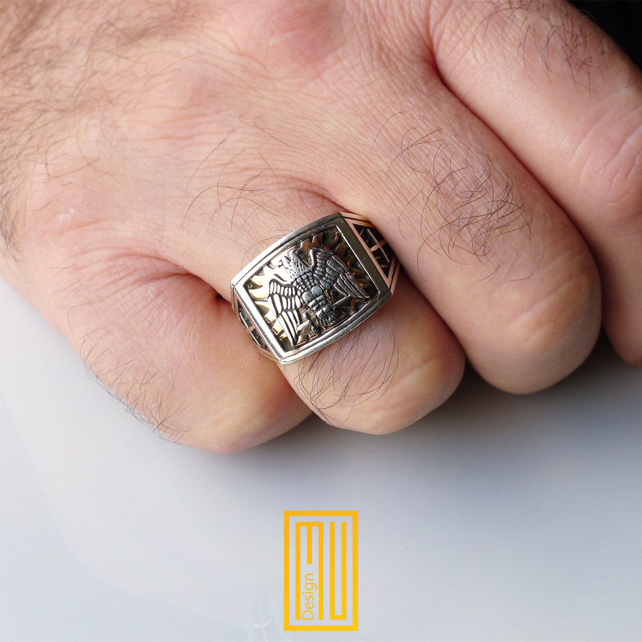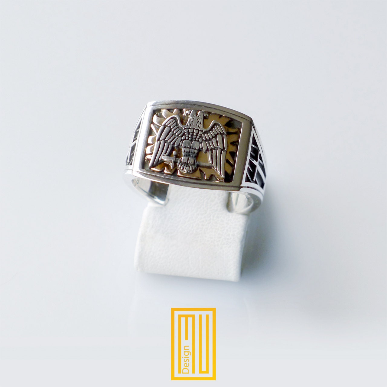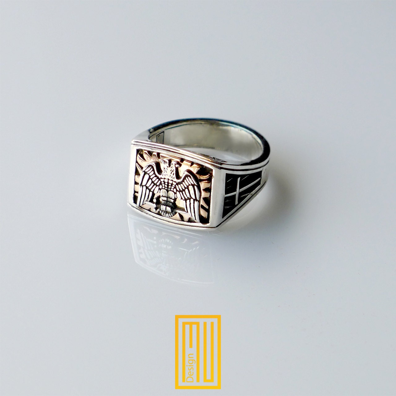 - Double Headed Eagle with a golden blaze background is on the front side of the ring